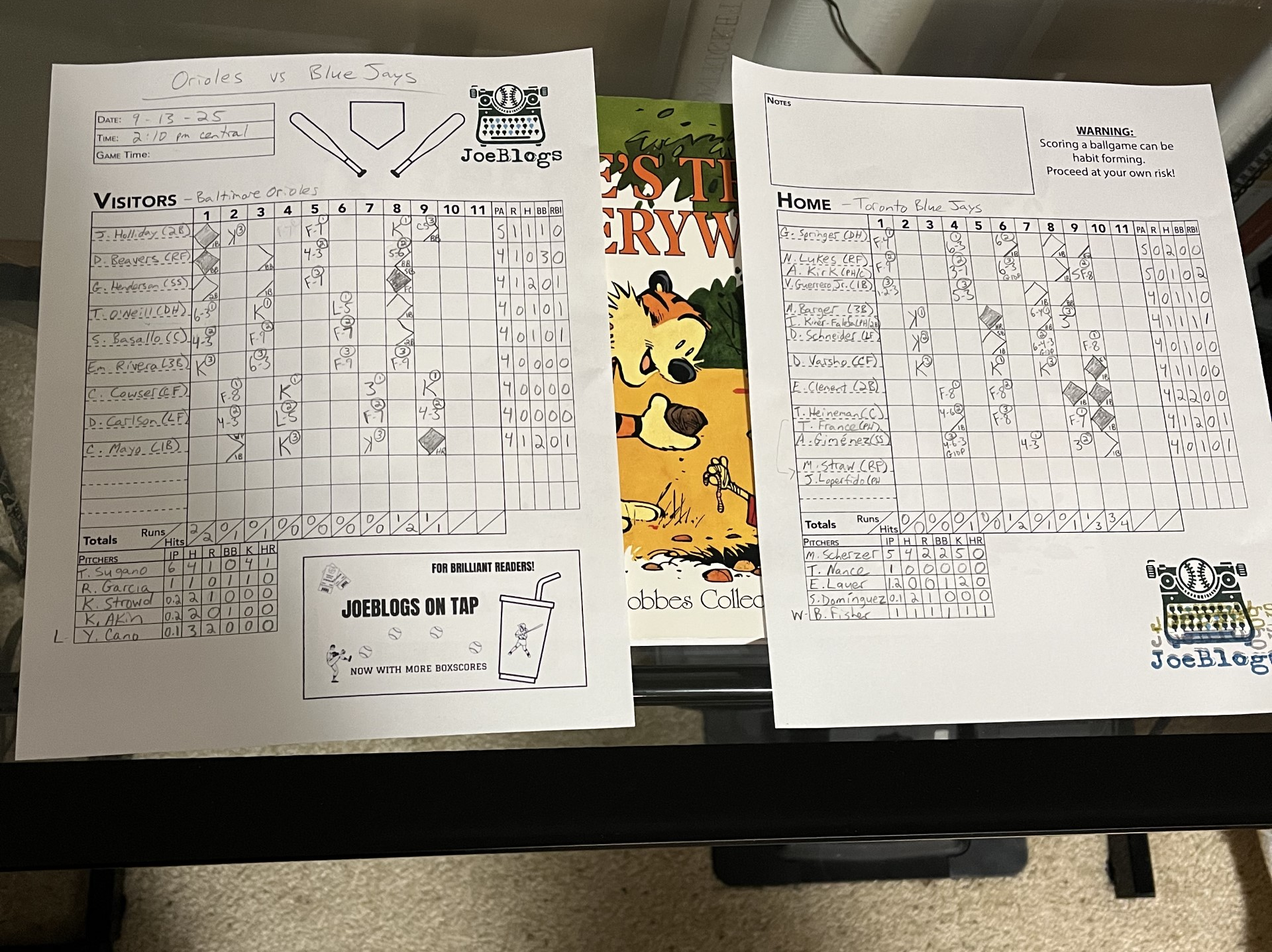 I'll share what I also shared in my email to Joe Posnanski with the scorecard. Declan actually watched like 20 minutes of the game. He was there with me and occasionally asked how it was going. But he mostly played Legos.